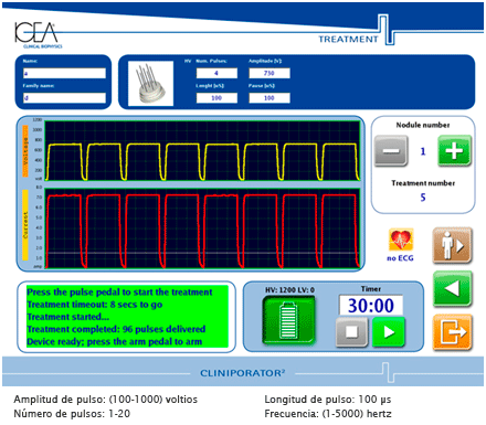 El Cliniporator entrega, mide y muestra la corriente que fluye a través del tejido durante el tratamiento. Esto permite a los médicos comprobar si el tratamiento ha sido realizado de acuerdo con los parámetros establecidos. Una vez hemos seleccionado el electrodo adecuado, el dispositivo se ajusta automáticamente a los parámetros de tratamiento de acuerdo con el “Standard Operating Procedure for Electrochemotherapy” en la práctica clínica. |