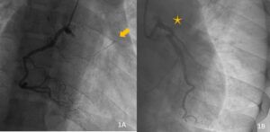 La coronariografía revela una arteria coronaria derecha sin lesiones significativas, observándose relleno colateral hacia la arteria descendente anterior (DA) (imagen 1A), con gran carga trombótica visible (flecha). La inyección selectiva de la coronaria izquierda muestra oclusión completa de la DA desde su ostium (imagen 1B).